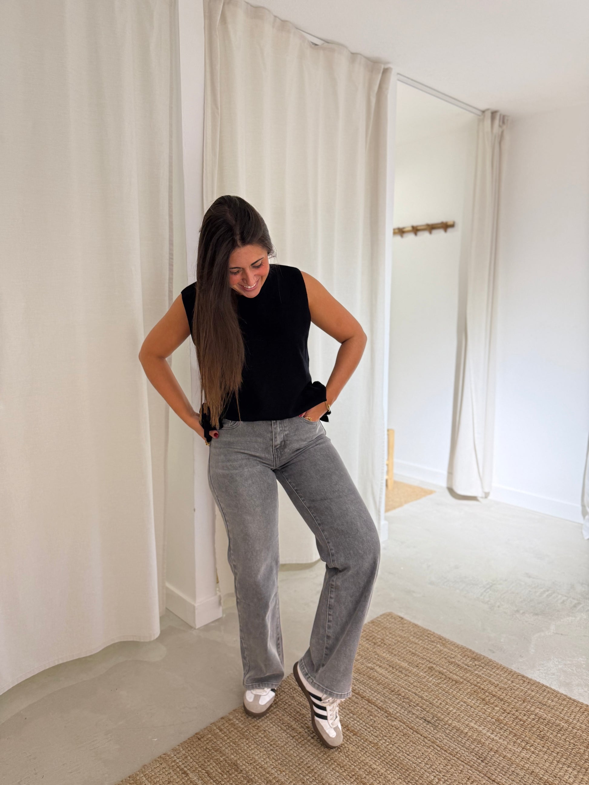 A Mariana mede 1,59cm e está a utilizar o tamanho único. O tamanho único corresponde ao tamanho S-XL.